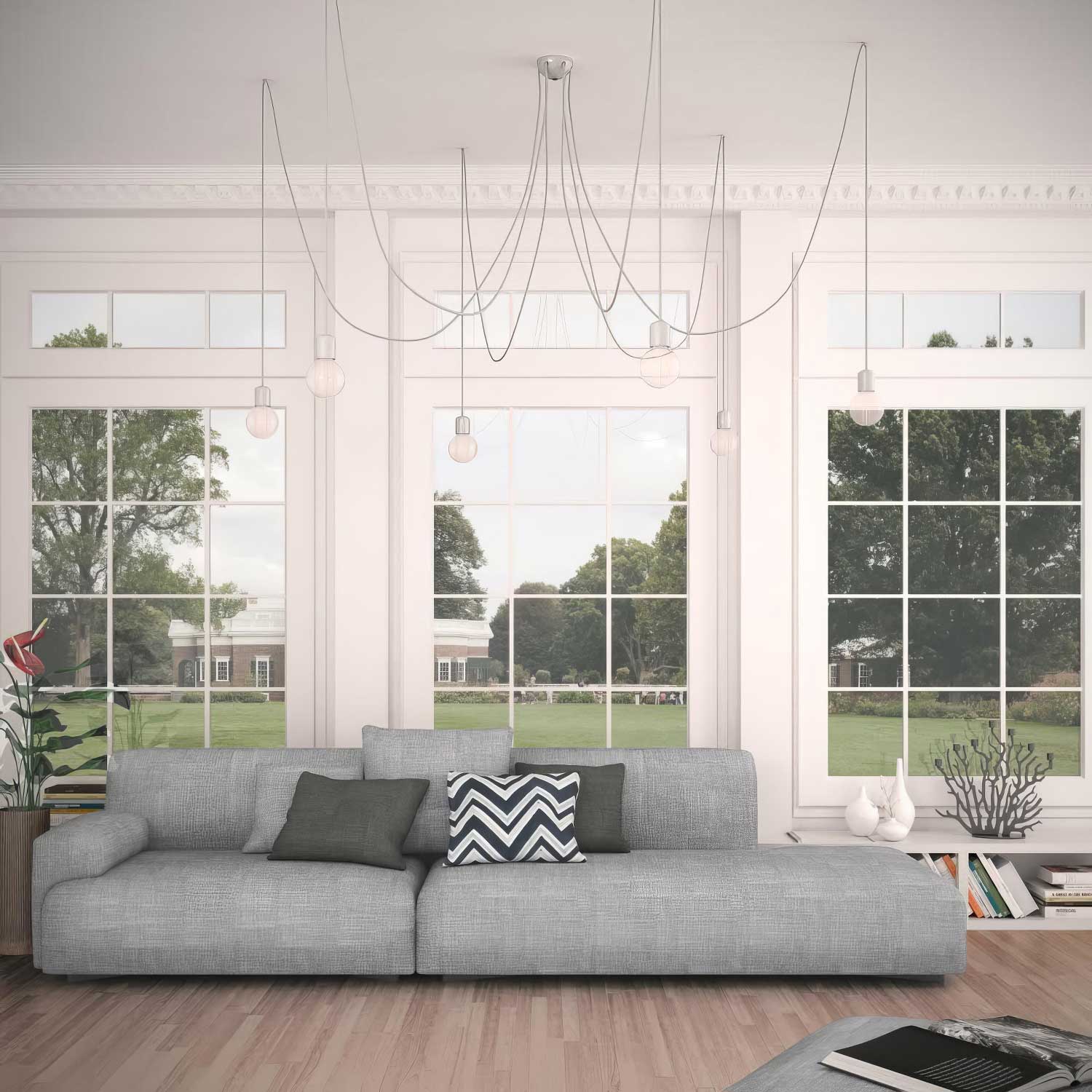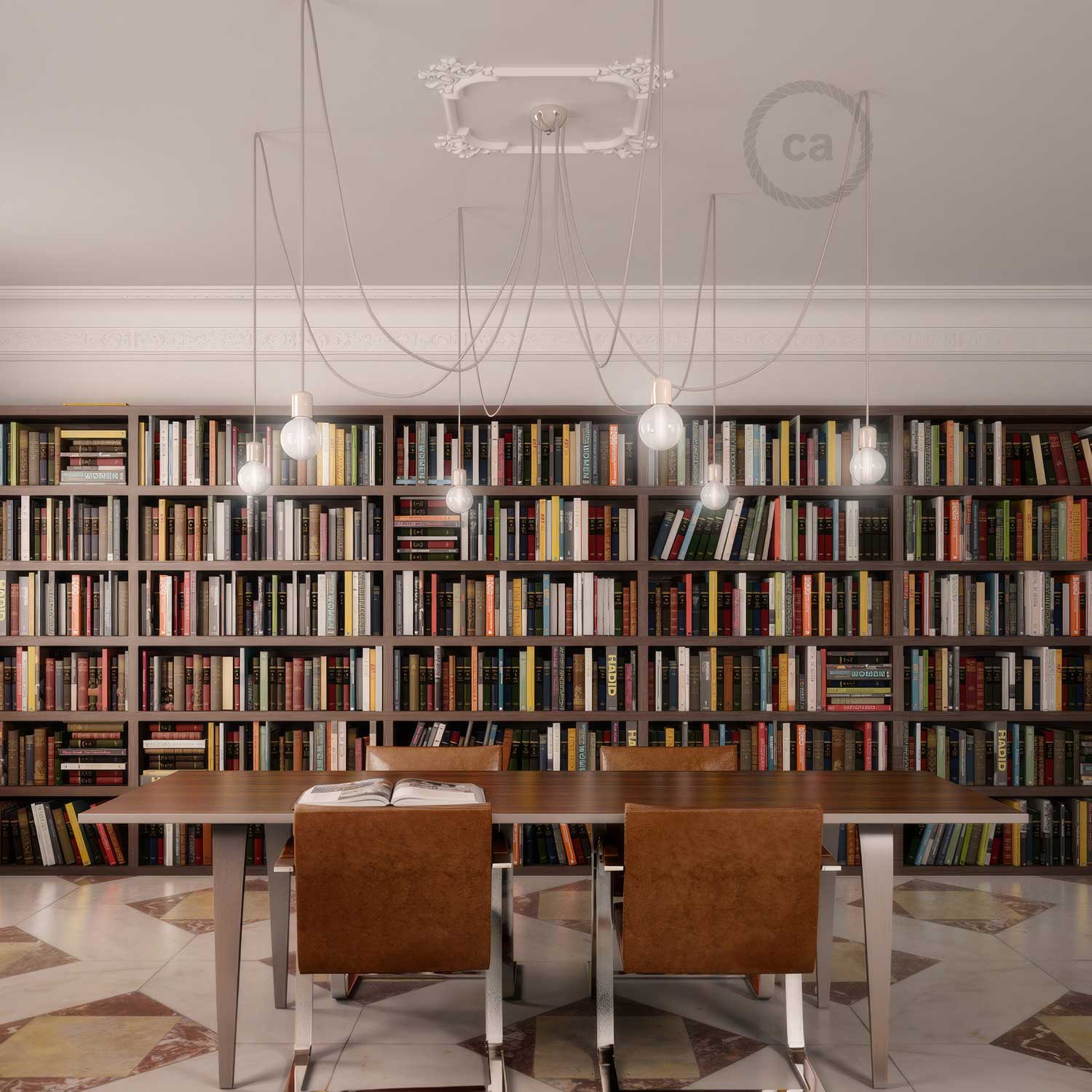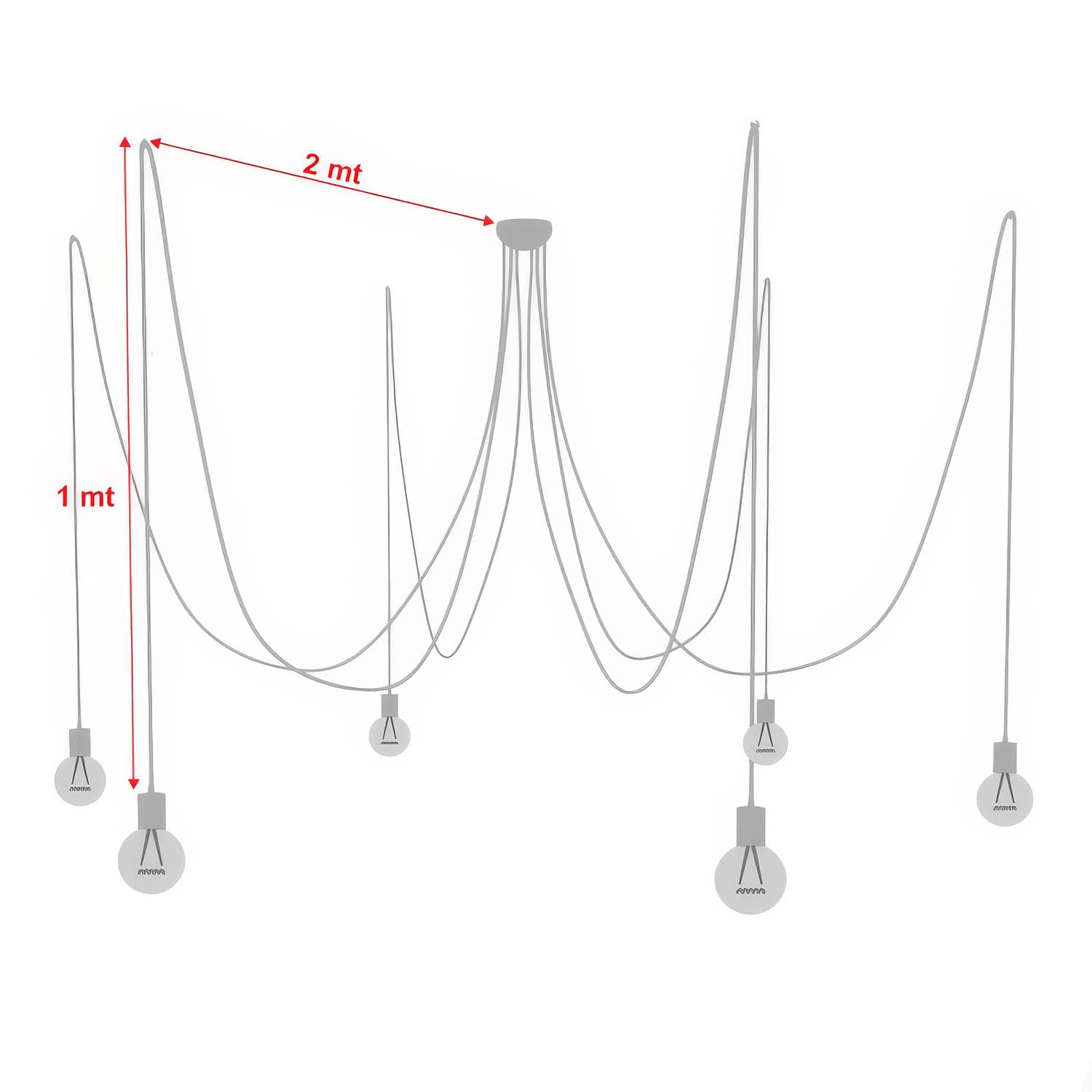 Die im Kit enthaltenen Kabelumlenker ermöglichen Ihnen, 6 Abhängungen von je 1 Meter im Abstand von 2 Metern zum zentralen Lampenbaldachin zu realisieren, oder Sie konfigurieren Spider nach Belieben, indem Sie jede Abhängung in unterschiedlichen Abständen und Höhen positionieren!